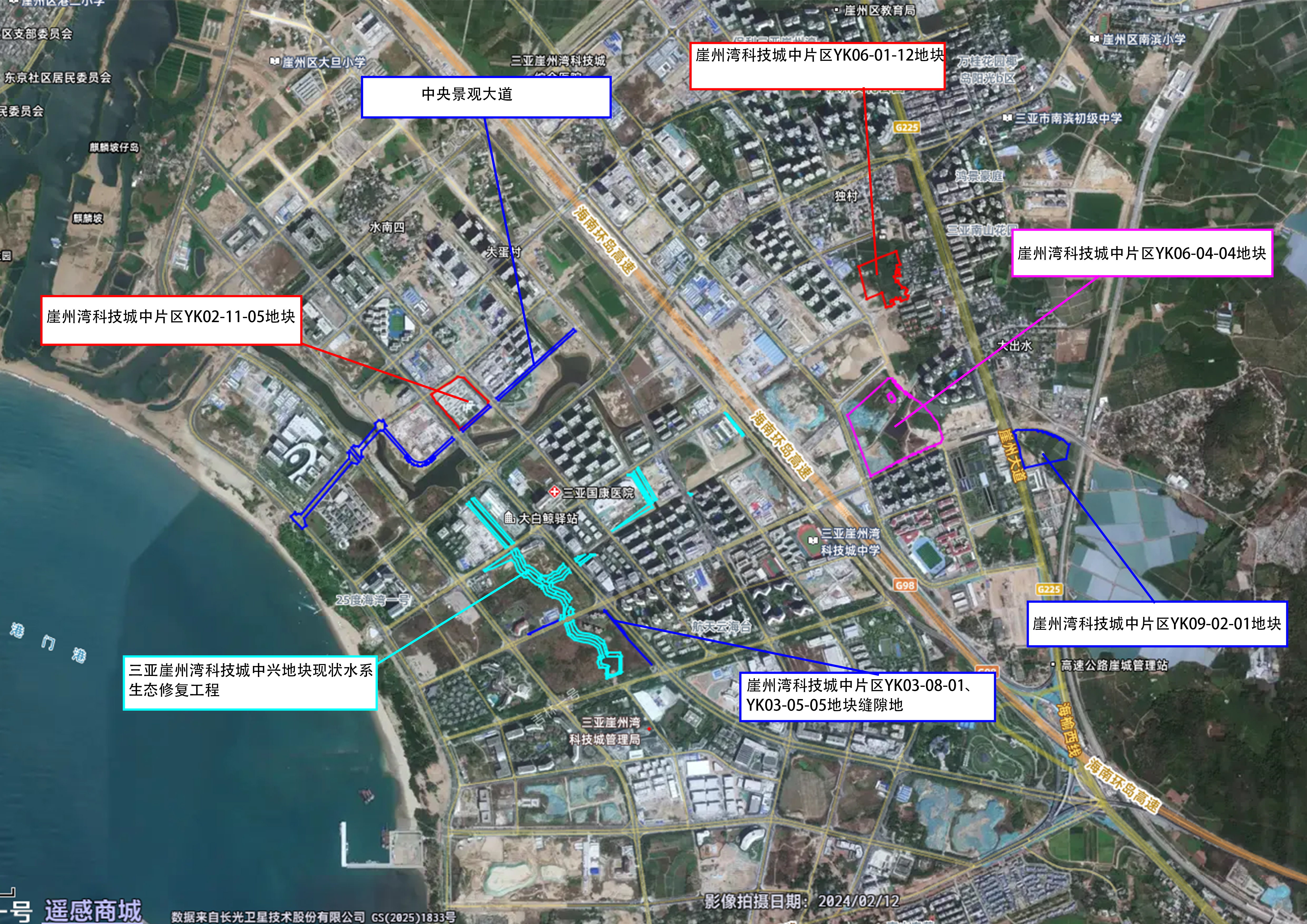 附图1:崖州湾科技城中片区YK02-11-05地块、崖州湾科技城中片区YK09-02-01地块、崖州湾科技城中片区YK06-04-04地块、崖州湾科技城中片区YK06-01-12地块、三亚崖州湾科技城中兴地块现状水系生态修复工程、崖州湾科技城中片区YK03-08-01、YK03-05-05地块缝隙地、中央景观大道等位置示意图;