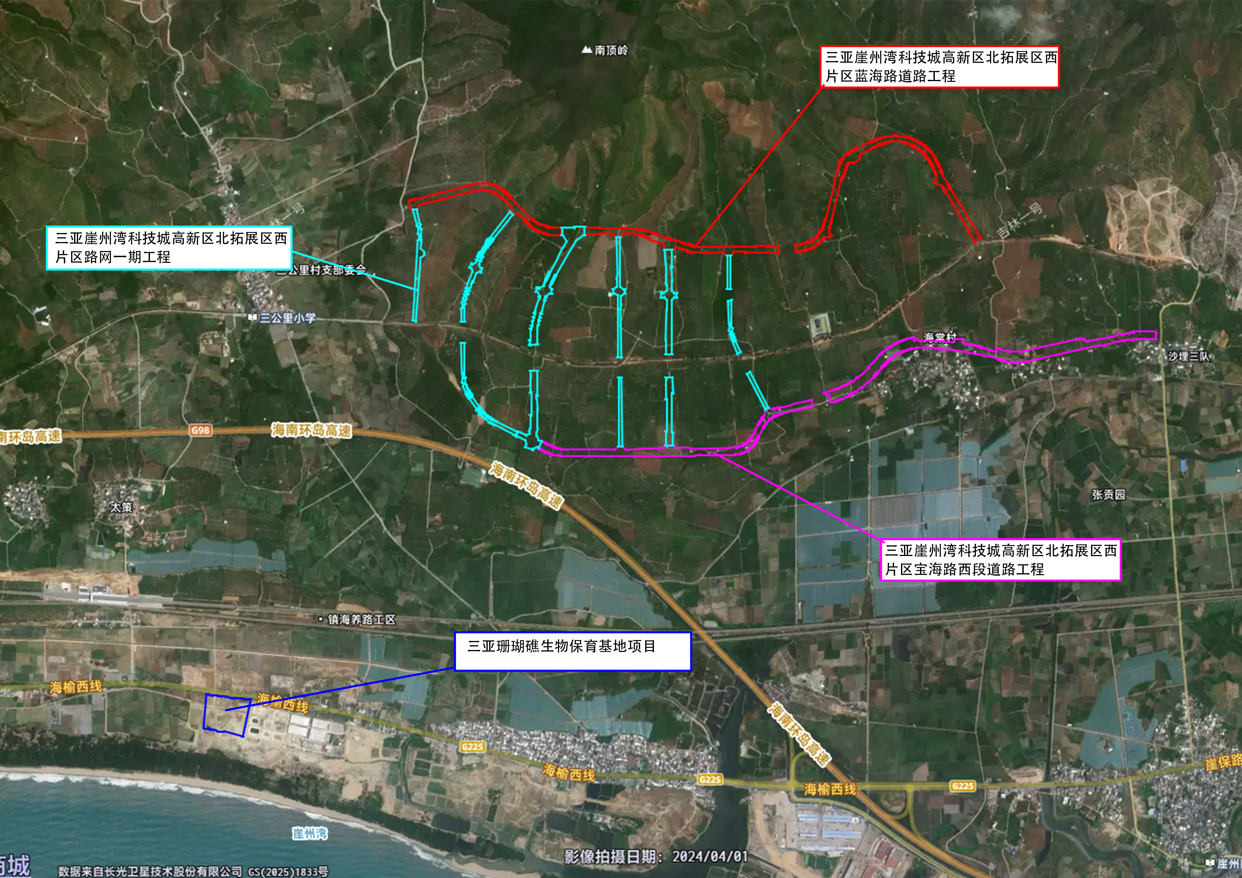 附图4:三亚珊瑚礁生物保育基地项目、三亚崖州湾科技城高新区北拓展区西片区路网一期工程、三亚崖州湾科技城高新区北拓展区西片区蓝海路道路工程、三亚崖州湾科技城高新区北拓展区西片区宝海路西段道路工程等位置示意图。