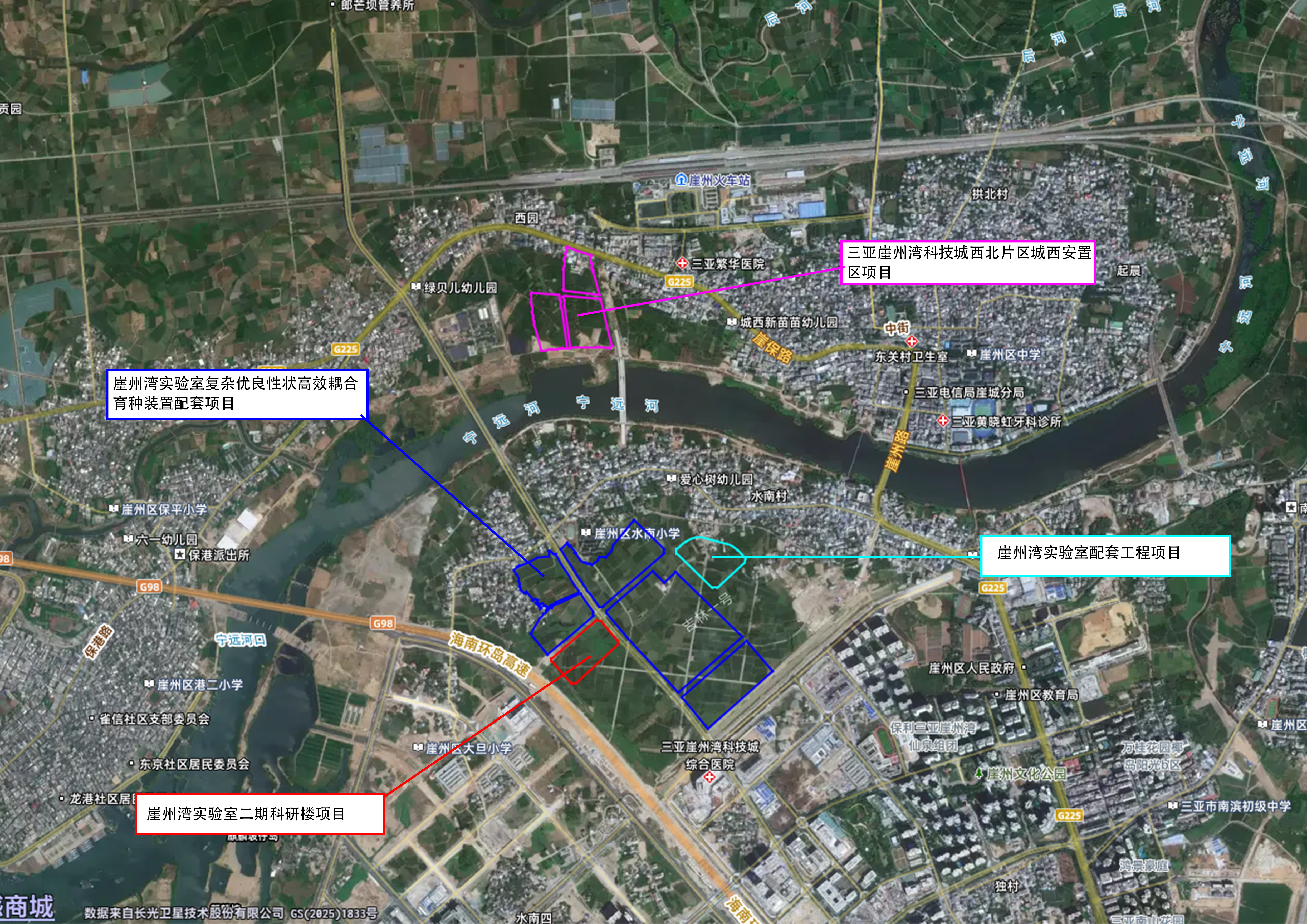 附图2:三亚崖州湾科技城西北片区城西安置区项目、崖州湾实验室二期科研楼以及配套工程项目、崖州湾实验室复杂优良性状高效耦合育种装置配套项目、崖州湾实验室配套工程等位置示意图;