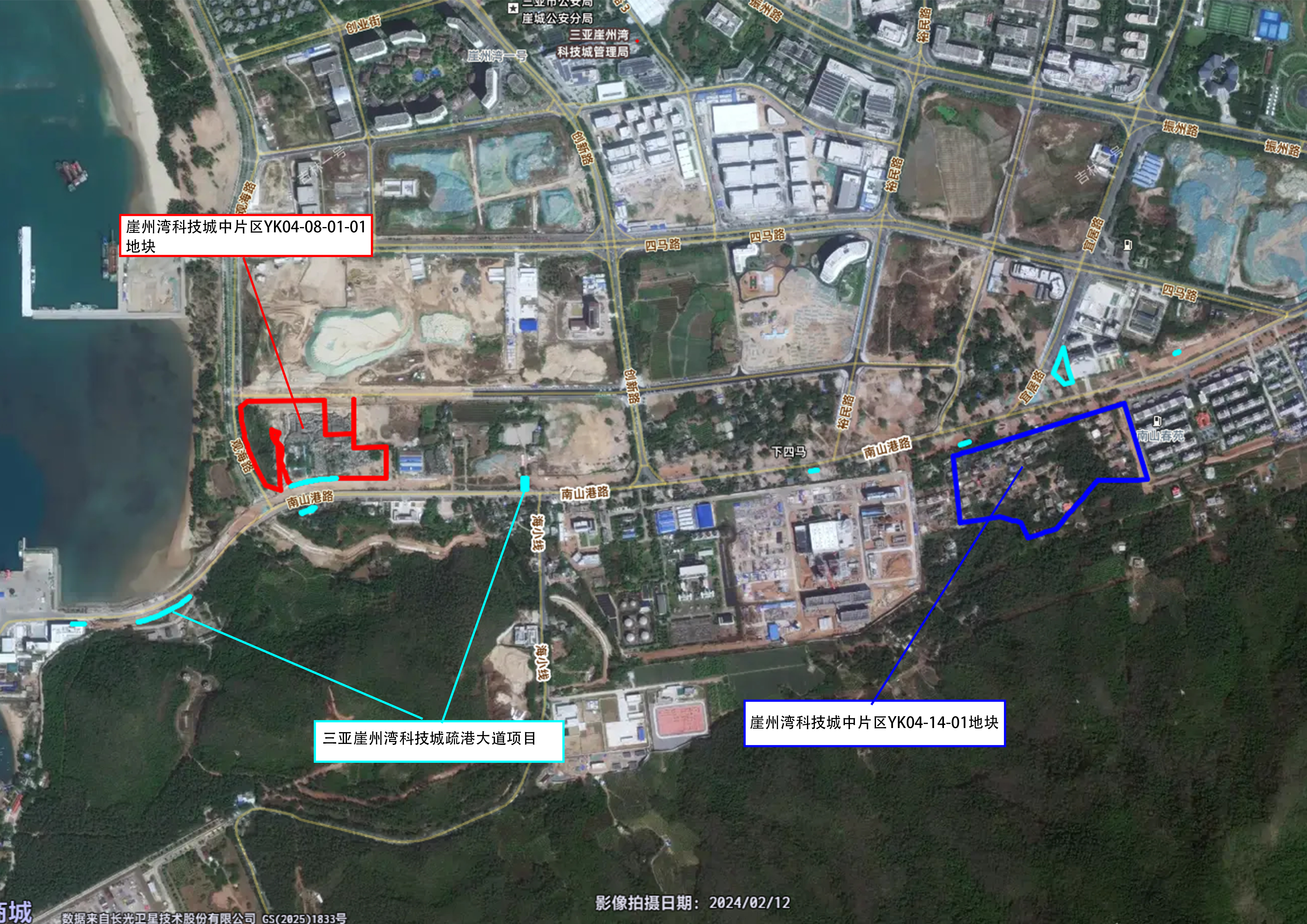 附图3:崖州湾科技城中片区YK04-14-01地块、崖州湾科技城中片区YK04-08-01-01地块、三亚崖州湾科技城疏港大道项目等位置示意图;