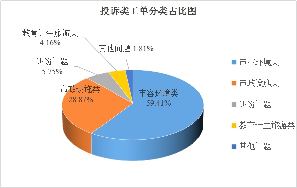 区指挥中心共受理办件8728件,已办结8242件,办结率为94.43%。其中投诉类7845件,占比89.88%;咨询类811件,占比9.29%;其他72件,占比0.82%。