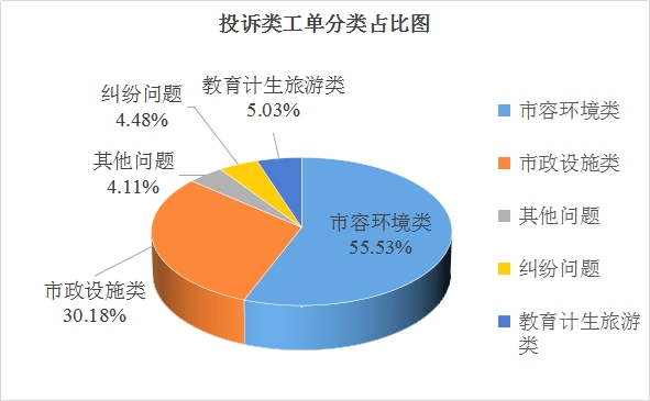 区指挥中心共受理办件7362件,已办结6583件,办结率为89.42%。其中投诉类6739件,占比91.54%;咨询类592件,占比8.04%;其他31件,占比0.42%。