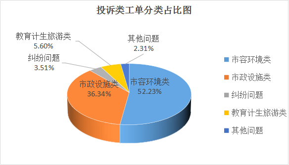 投诉类工单主要以市容环境类为主,共受理办件3228件,占比52.23%;其次为市政设施类2246件,占比36.34%;教育计生旅游类346件,占比5.60%;纠纷问题217件,占比3.51%;其他问题143件,占比2.31%。